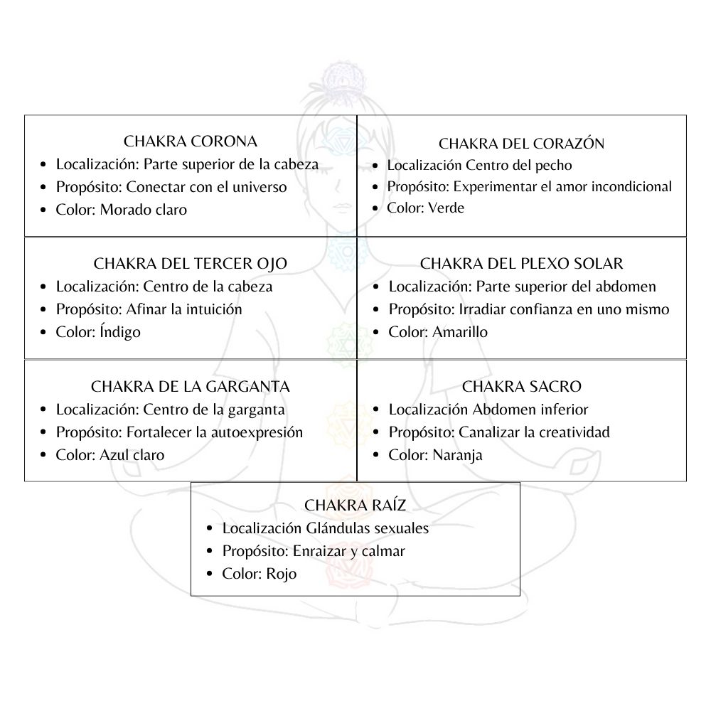 Aquí están los diferentes tipos de chakras, sus ubicaciones y sus colores:
